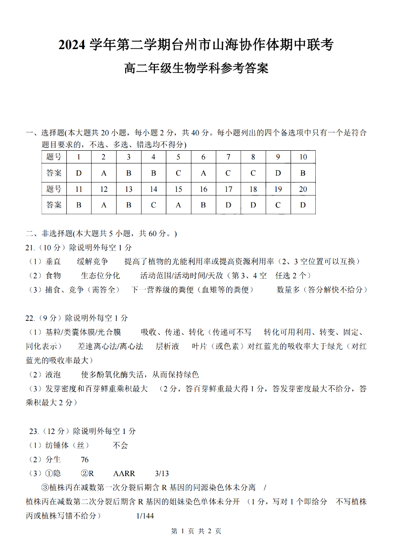 台州市山海协作体2024学年高二第二学期期中联考 生物答案.pdf