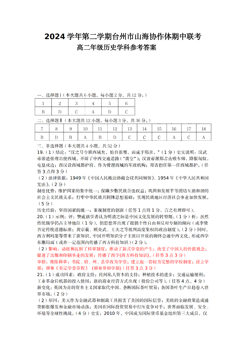 台州市山海协作体2024学年高二第二学期期中联考 历史答案.pdf