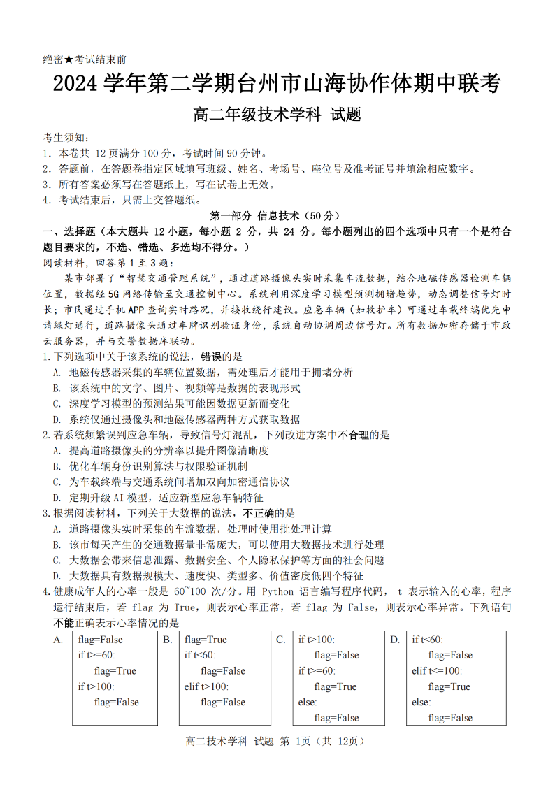 台州市山海协作体2024学年高二第二学期期中联考 技术.pdf