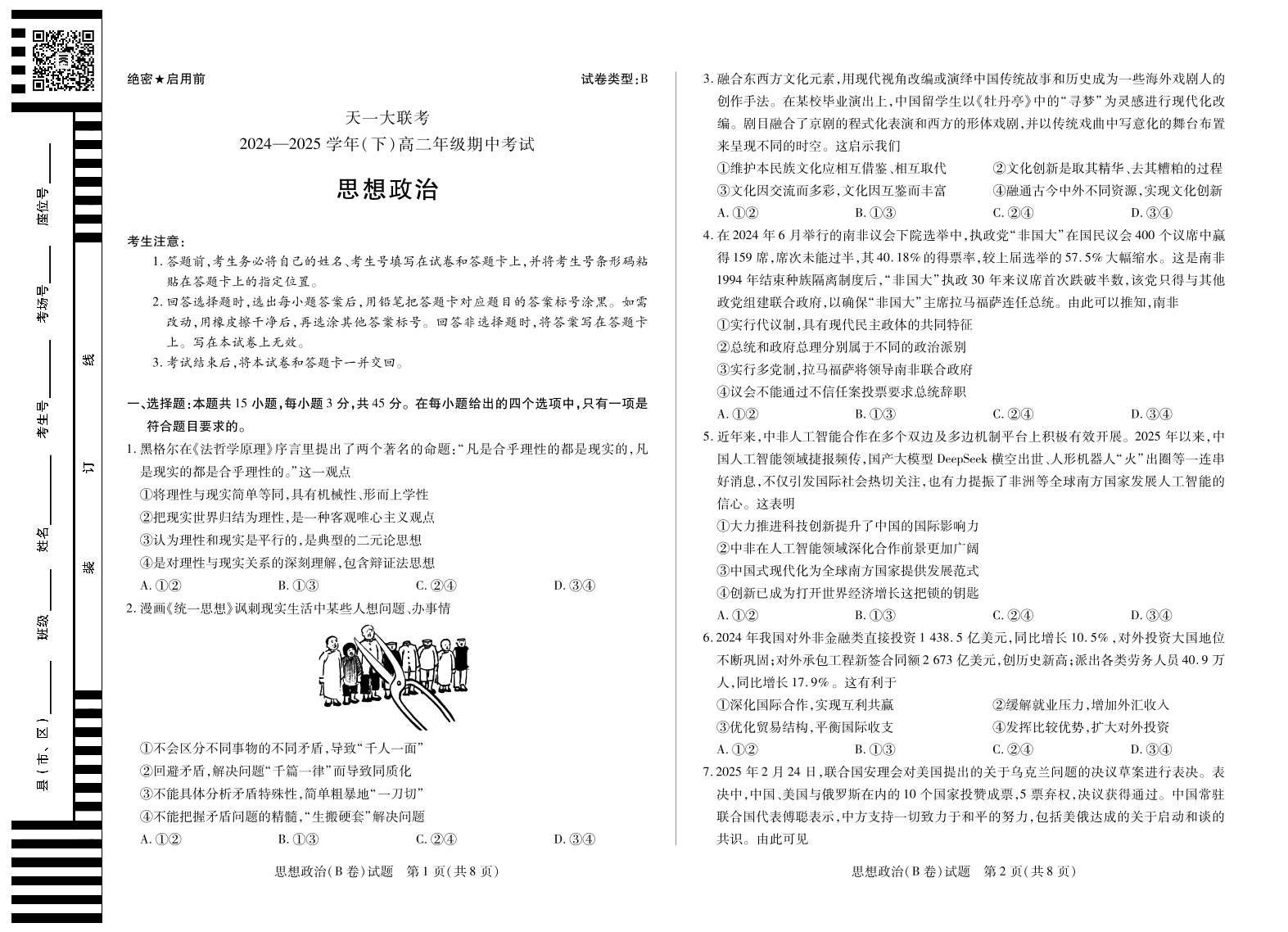 天一大联考·2024-2025学年(下)高二年级期中考试 政治B卷.pdf