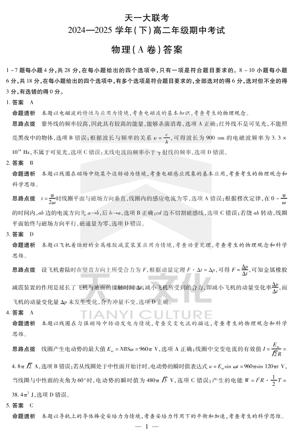 天一大联考·2024-2025学年(下)高二年级期中考试 物理A卷答案.pdf