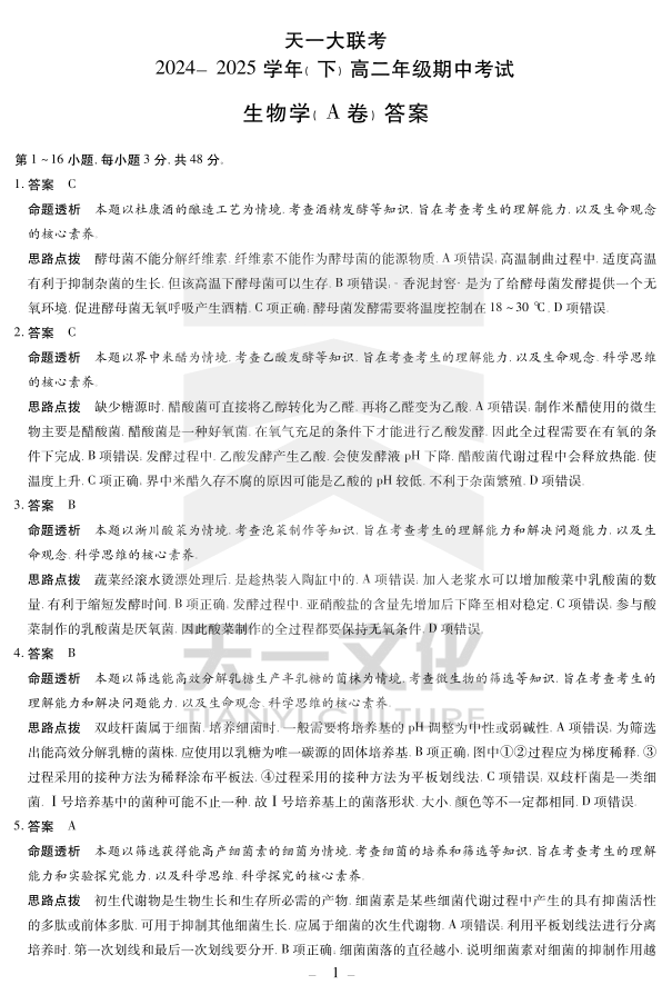 天一大联考·2024-2025学年(下)高二年级期中考试 生物A卷答案.pdf