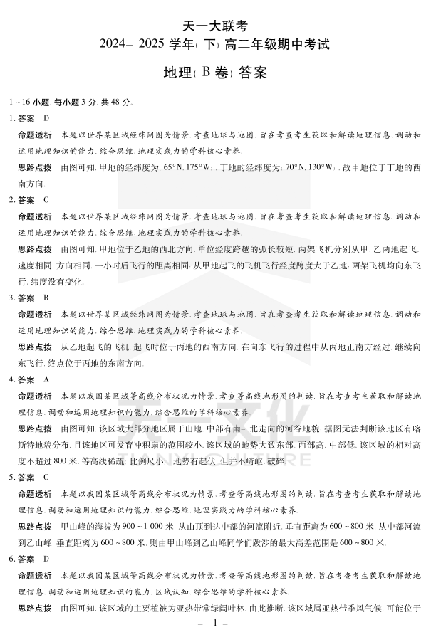 天一大联考·2024-2025学年(下)高二年级期中考试 地理B卷答案.pdf