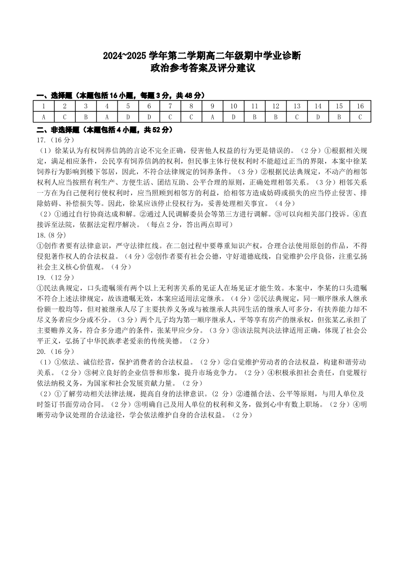 太原市2024-2025学年第二学期高二年级期中学业诊断 政治答案.pdf