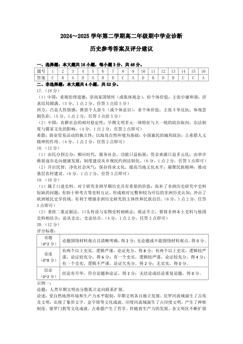 太原市2024-2025学年第二学期高二年级期中学业诊断 历史答案.pdf