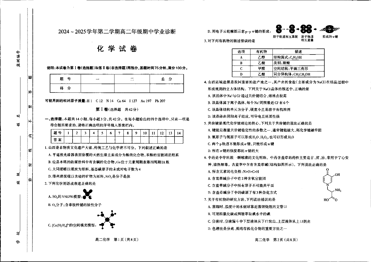 太原市2024-2025学年第二学期高二年级期中学业诊断 化学.pdf