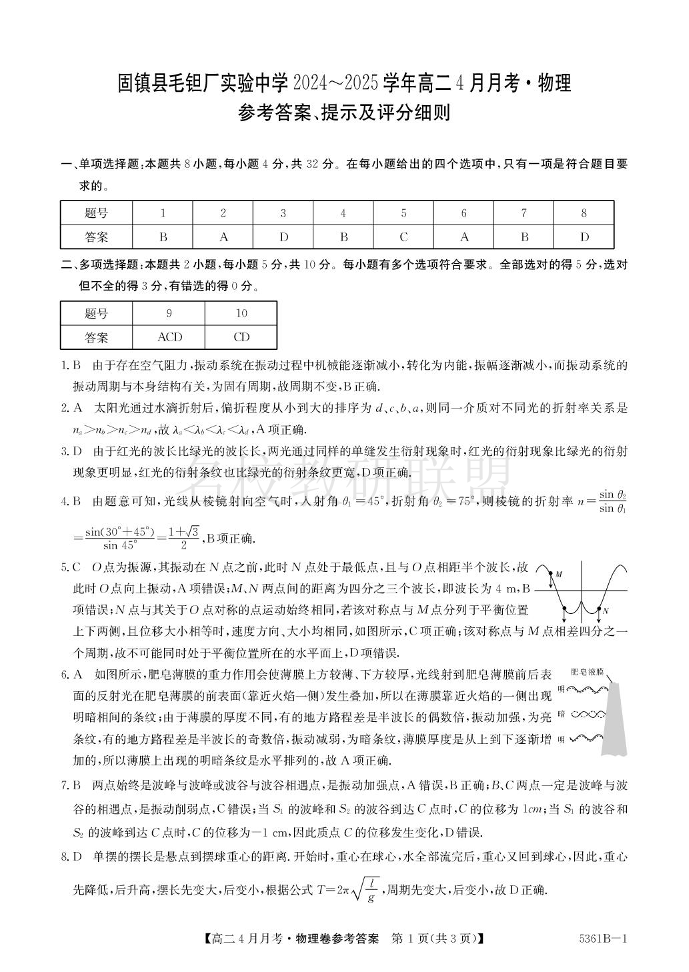安徽省固镇县毛钽厂实验中学2024-2025学年高二下学期4月月考 物理答案.pdf