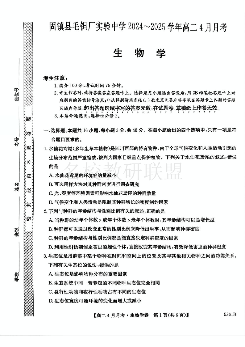 安徽省固镇县毛钽厂实验中学2024-2025学年高二下学期4月月考 生物.pdf