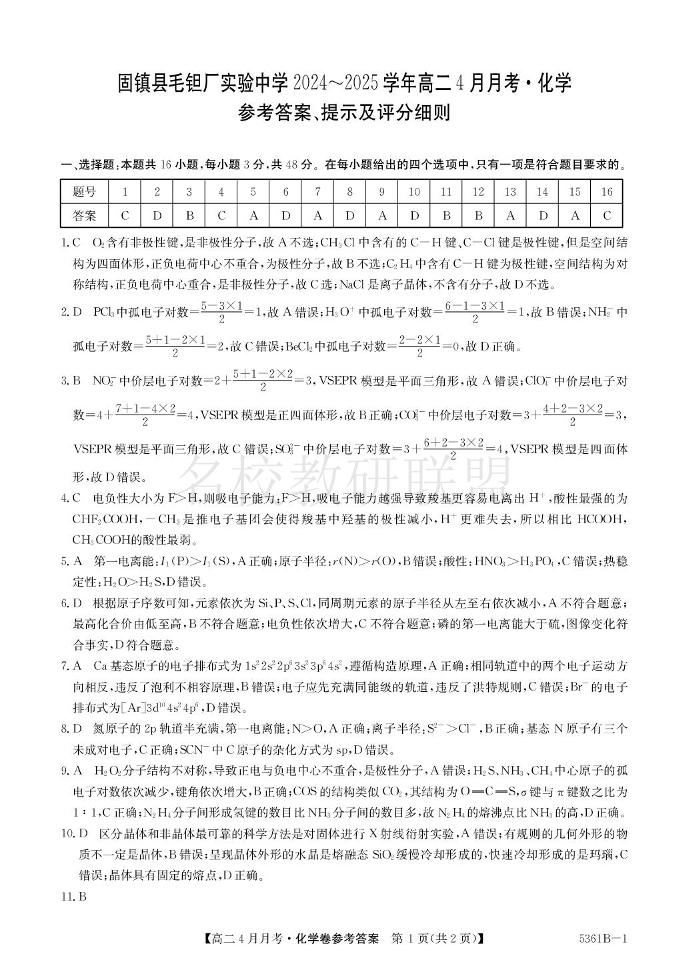 安徽省固镇县毛钽厂实验中学2024-2025学年高二下学期4月月考 化学答案.pdf