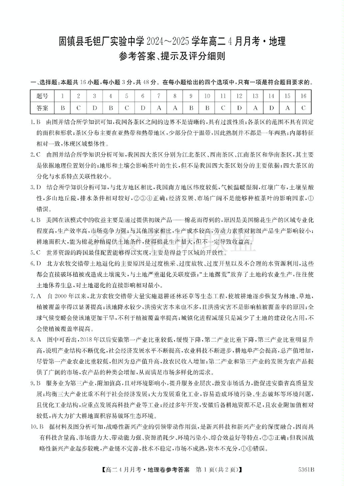 安徽省固镇县毛钽厂实验中学2024-2025学年高二下学期4月月考 地理答案.pdf