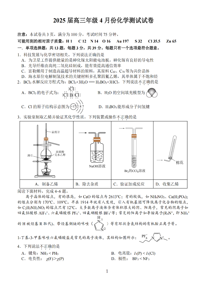 江苏省海安、金陵、宿迁三校2025届高三年级4月份测试 化学(含答案).pdf