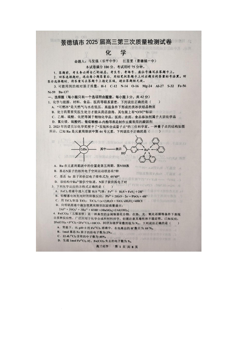 江西省景德镇市2025届高三第三次质量检测 化学(含答案).pdf