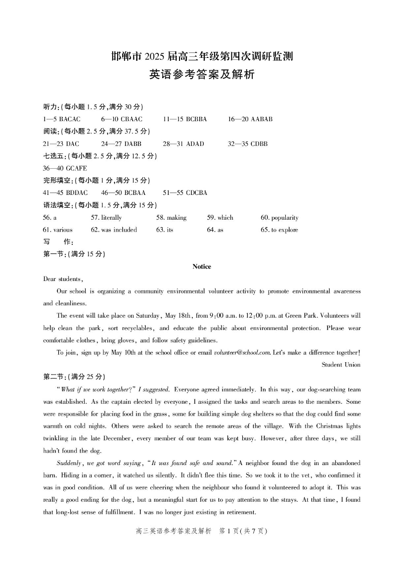 河北省邯郸市2025届高三年级第四次调研监测 英语答案.pdf