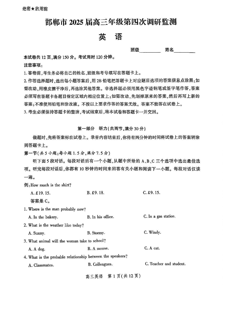 河北省邯郸市2025届高三年级第四次调研监测 英语.pdf