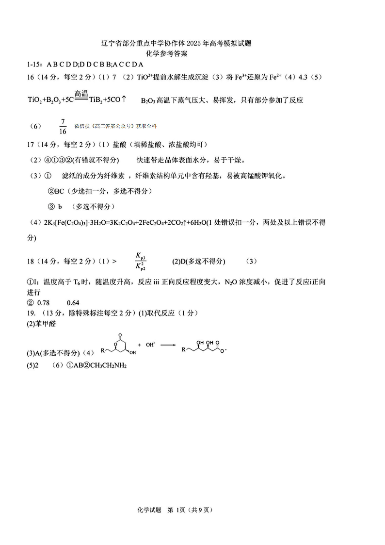 辽宁省部分重点中学协作体2025年4月高考模拟考试 化学答案.pdf