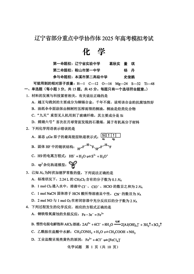辽宁省部分重点中学协作体2025年4月高考模拟考试 化学.pdf