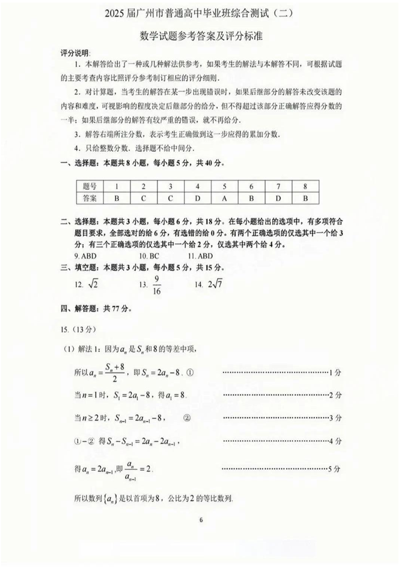 2025年广州市普通高中毕业班综合测试(二)数学答案.pdf
