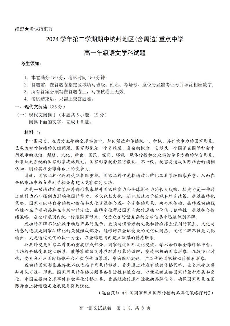杭州地区(含周边)重点中学2024学年高一第二学期期中联考 语文.pdf