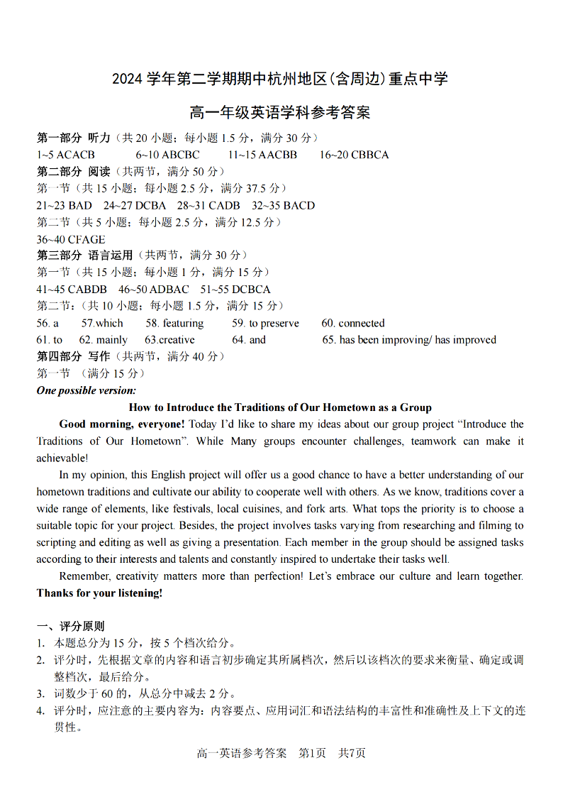 杭州地区(含周边)重点中学2024学年高一第二学期期中联考 英语答案.pdf