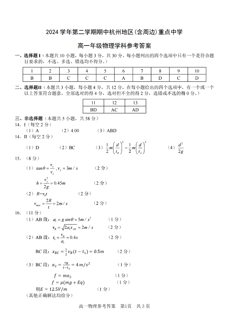杭州地区(含周边)重点中学2024学年高一第二学期期中联考 物理答案.pdf