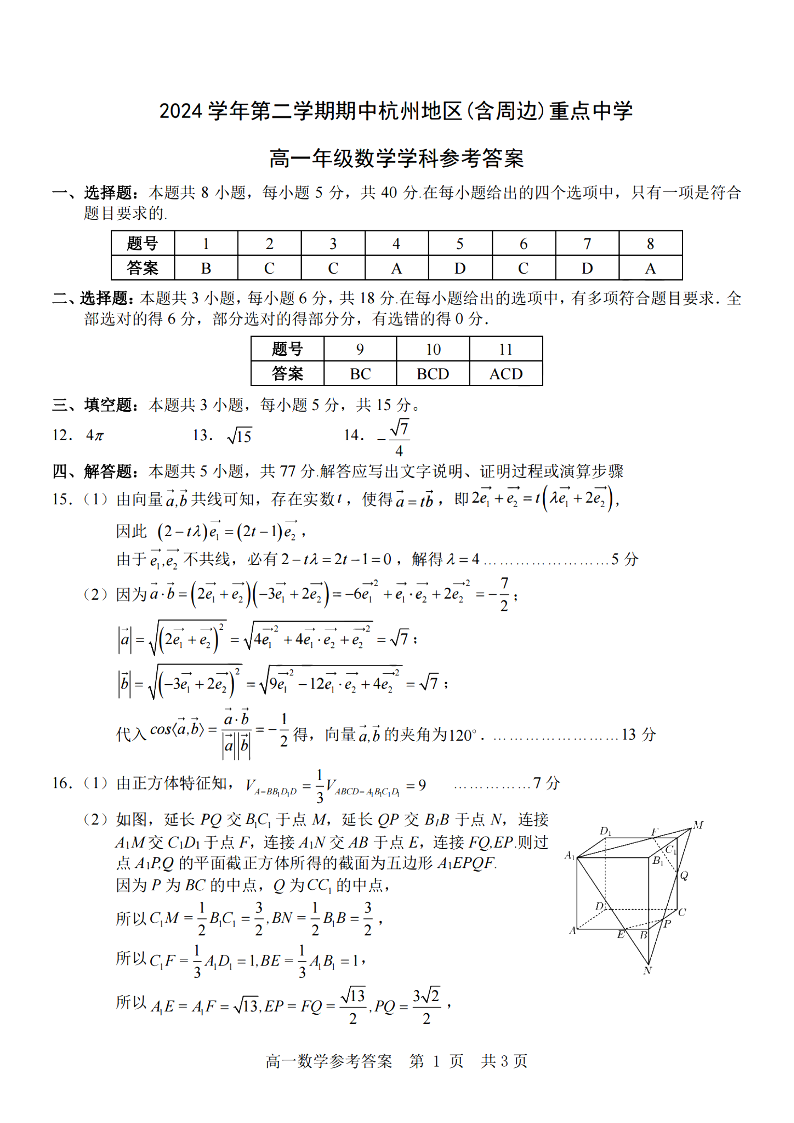 杭州地区(含周边)重点中学2024学年高一第二学期期中联考 数学答案.pdf