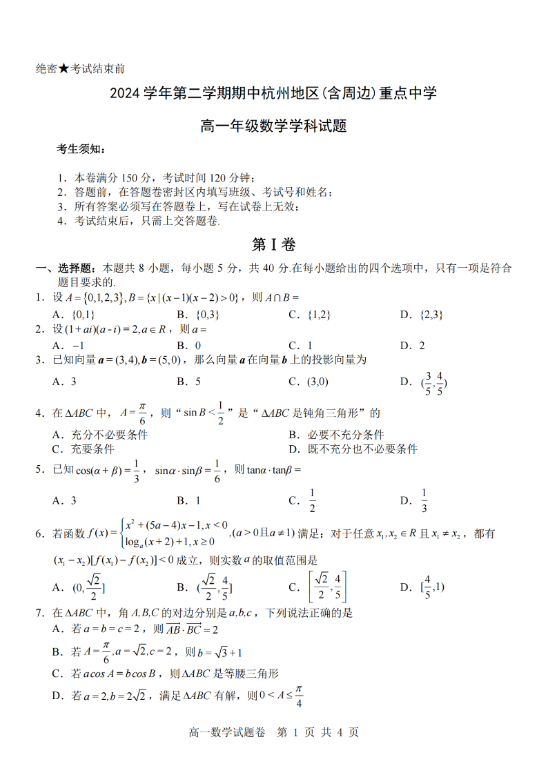 杭州地区(含周边)重点中学2024学年高一第二学期期中联考 数学.pdf