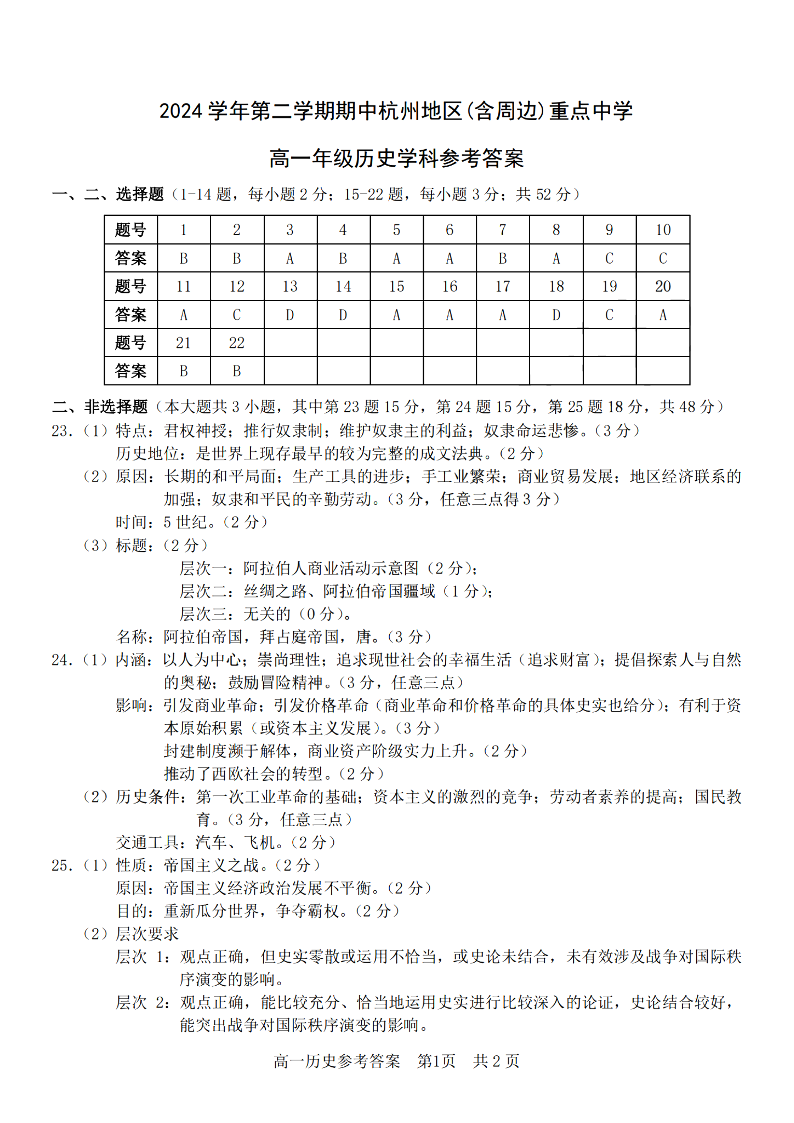 杭州地区(含周边)重点中学2024学年高一第二学期期中联考 历史答案.pdf