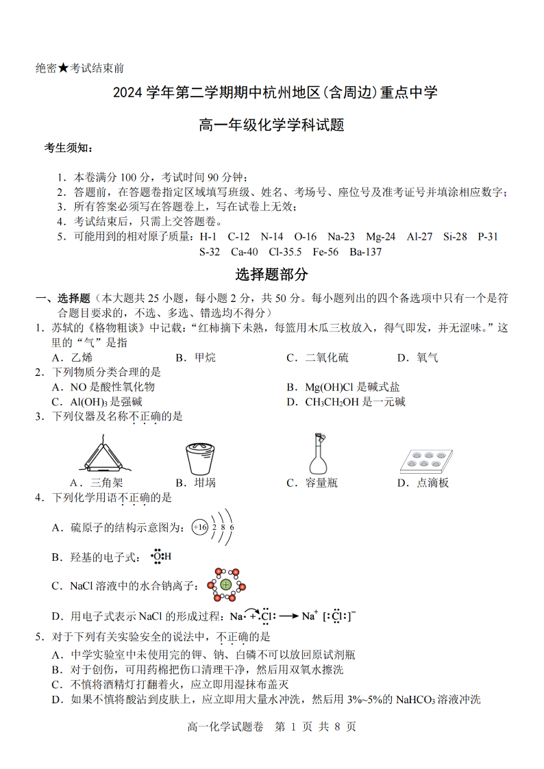 杭州地区(含周边)重点中学2024学年高一第二学期期中联考 化学.pdf
