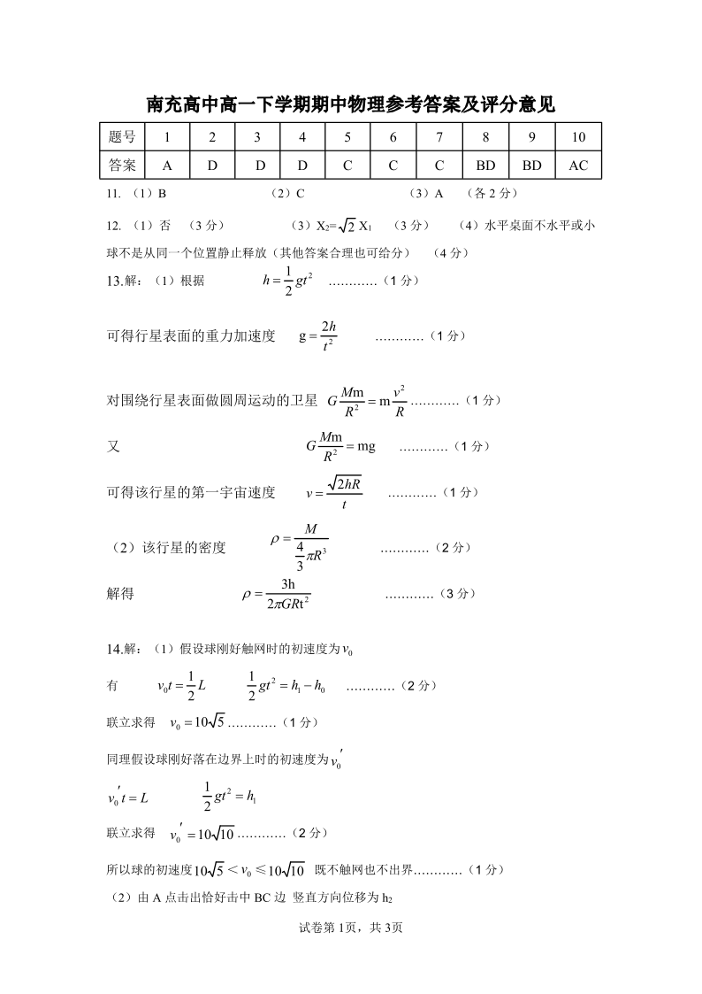 四川省南充高中2024级高一下学期期中考试 物理答案.pdf