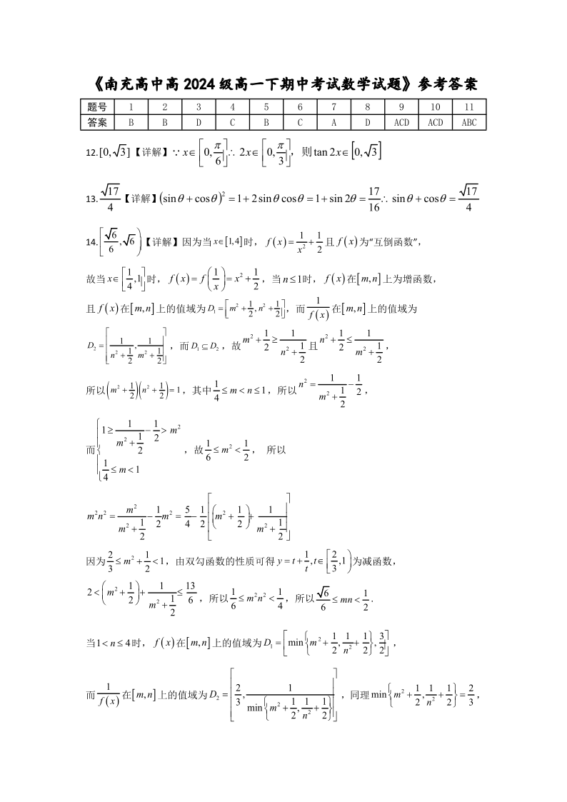 四川省南充高中2024级高一下学期期中考试 数学答案.pdf