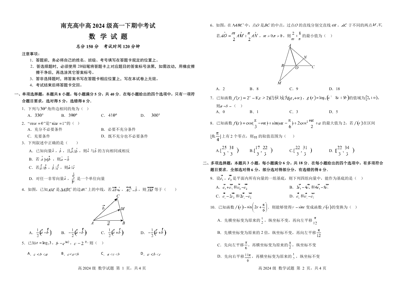 四川省南充高中2024级高一下学期期中考试 数学.docx