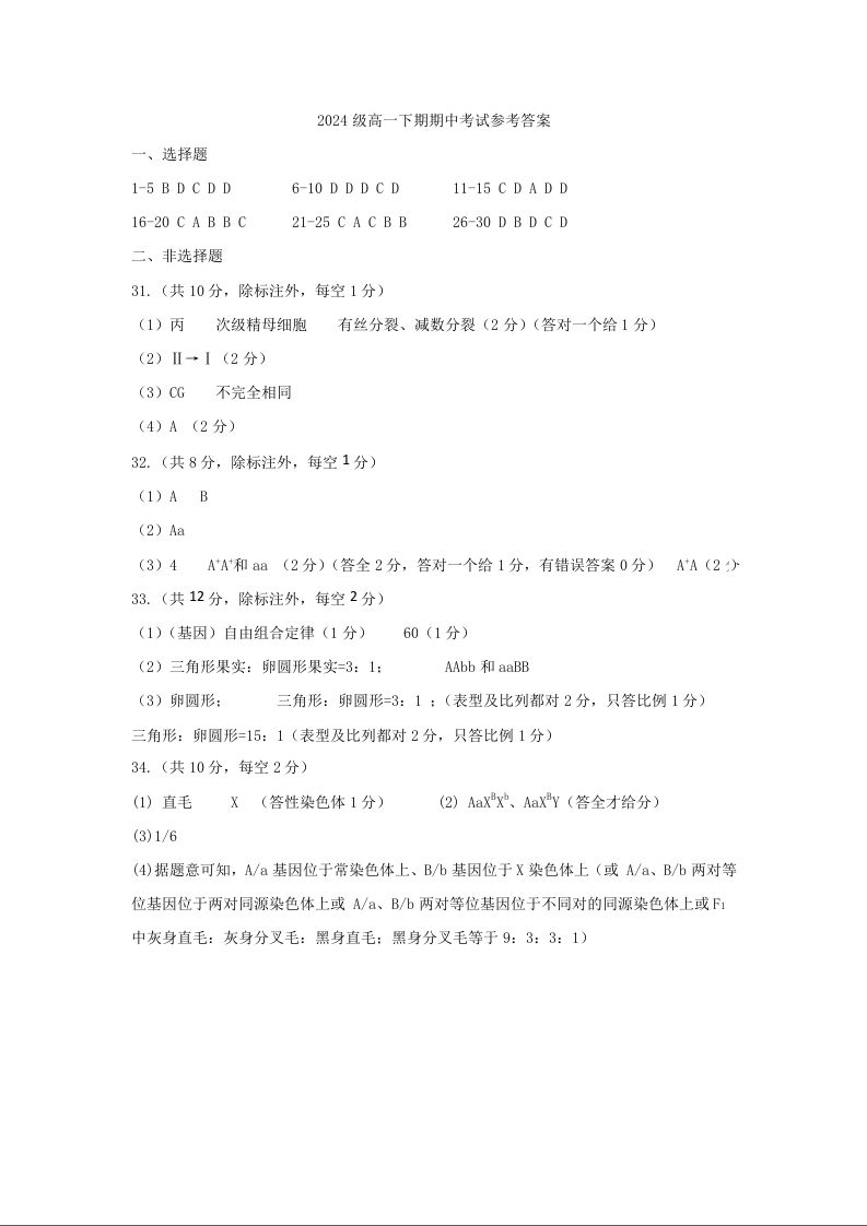 四川省南充高中2024级高一下学期期中考试 生物答案.docx