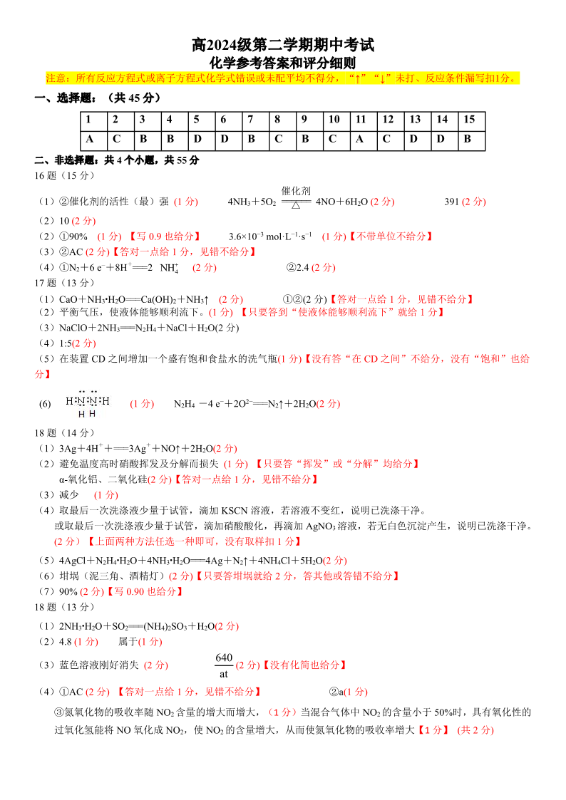 四川省南充高中2024级高一下学期期中考试 化学答案.pdf