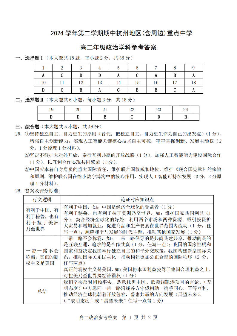 杭州地区(含周边)重点中学2024学年高二第二学期期中联考 政治答案.pdf