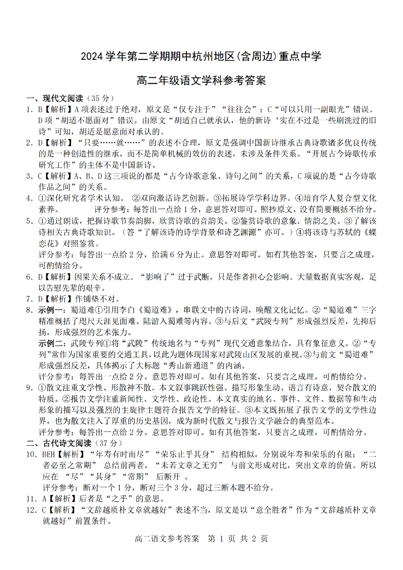 杭州地区(含周边)重点中学2024学年高二第二学期期中联考 语文答案.pdf