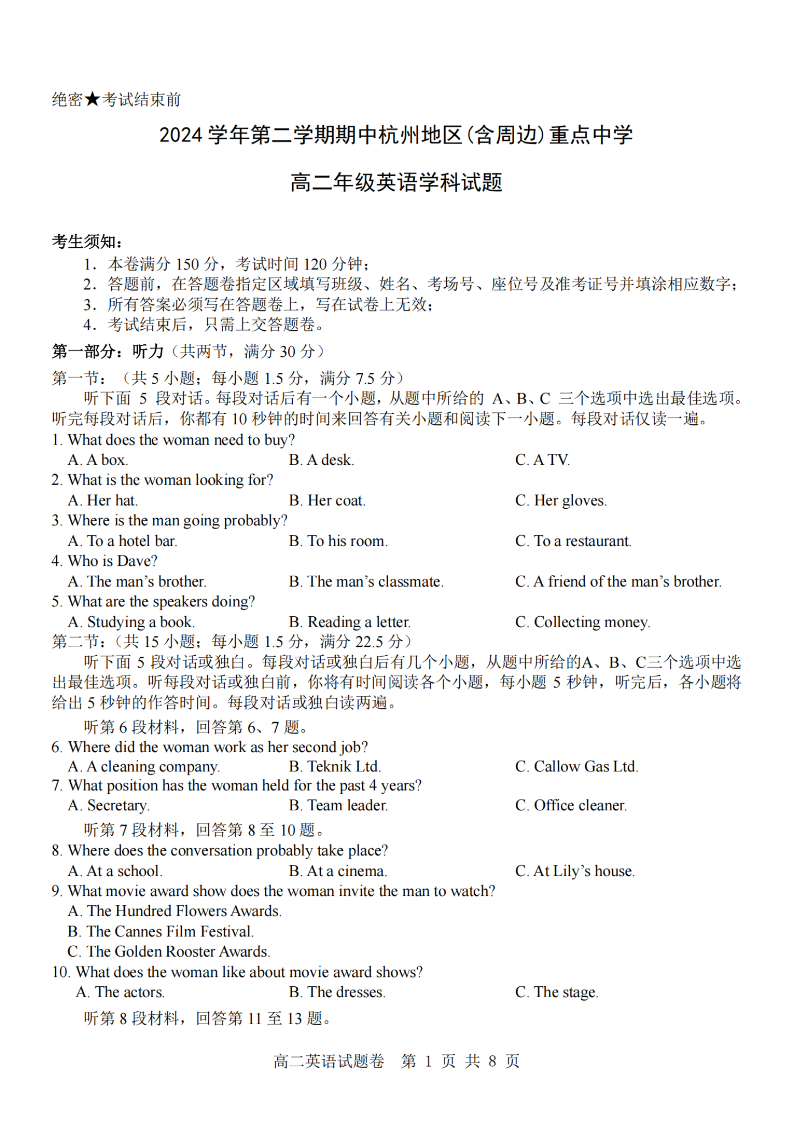杭州地区(含周边)重点中学2024学年高二第二学期期中联考 英语.pdf