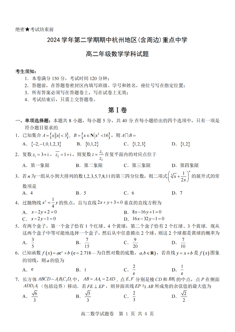 杭州地区(含周边)重点中学2024学年高二第二学期期中联考 数学.pdf