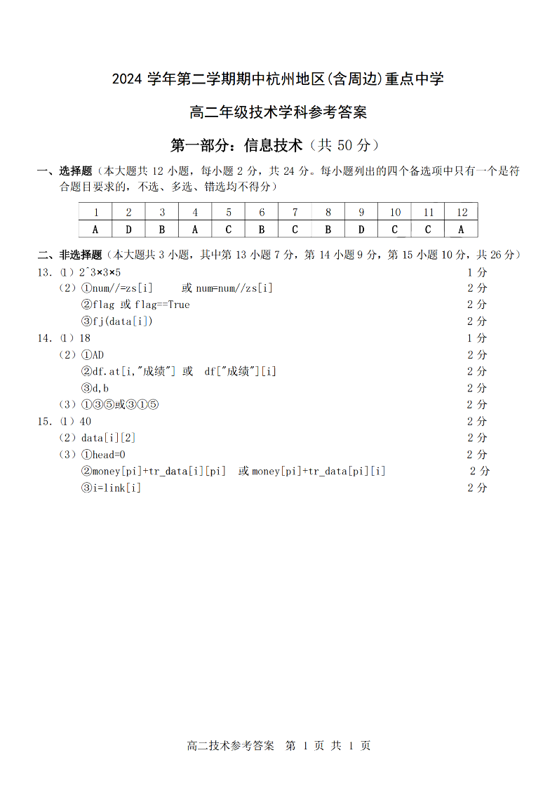 杭州地区(含周边)重点中学2024学年高二第二学期期中联考 技术答案.pdf