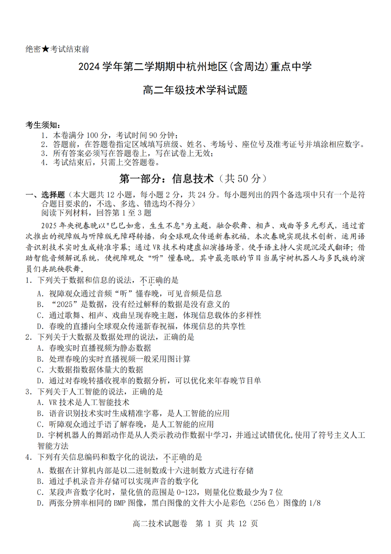 杭州地区(含周边)重点中学2024学年高二第二学期期中联考 技术.pdf