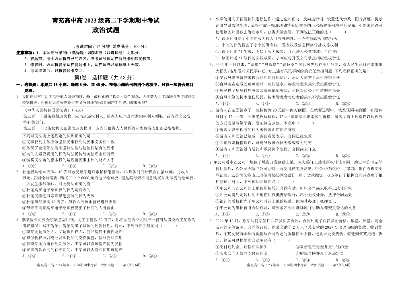 四川省南充高中高2023级高二下学期期中考试 政治.pdf