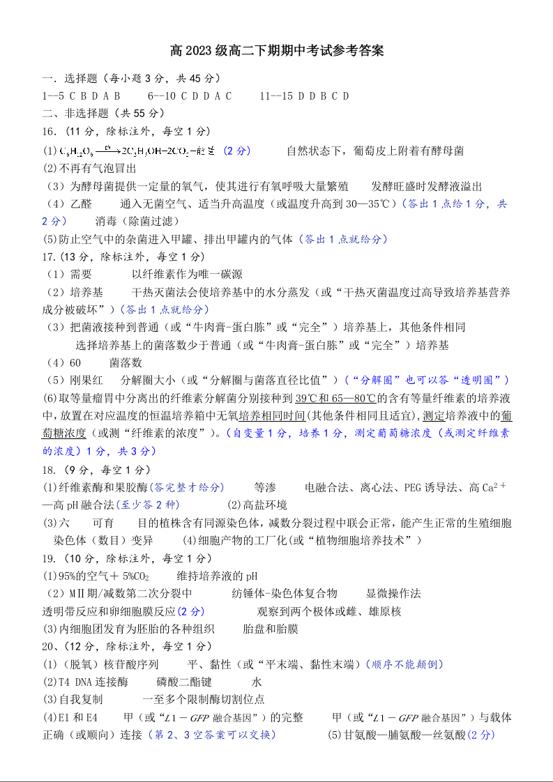 四川省南充高中高2023级高二下学期期中考试 生物答案.docx