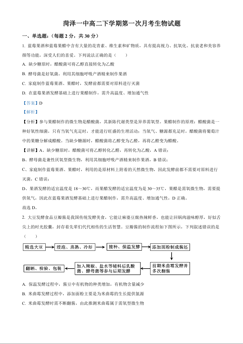 山东省菏泽市第一中学2024-2025学年高二下学期第一次月考 生物答案.docx
