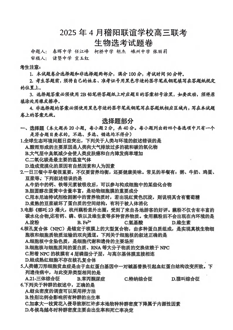2025年4月稽阳联谊学校高三联考 生物.pdf