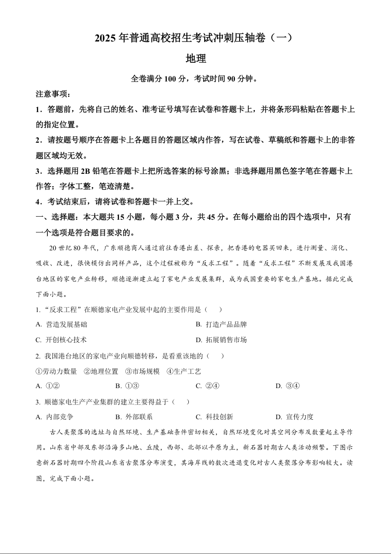 2025年普通高校招生考试冲刺压轴卷(一)地理.docx