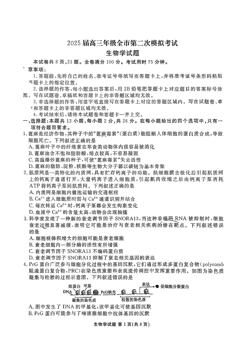 张家口市2025届高三年级第二次模拟考试 生物.pdf