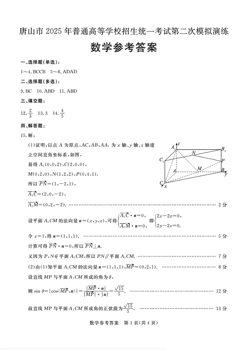 唐山市2025年普通高中第二次模拟演练 数学答案.pdf