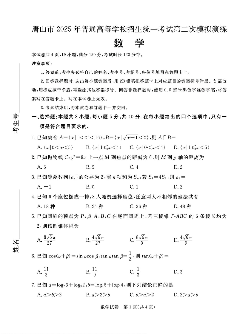 唐山市2025年普通高中第二次模拟演练 数学.pdf