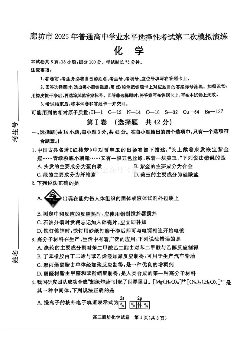 唐山市2025年普通高中第二次模拟演练 化学.pdf