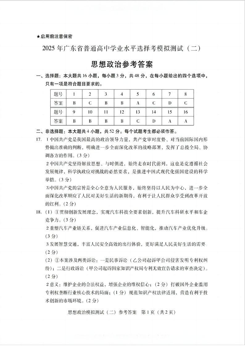 广东省2025年普通高等学校招生全国统一考试模拟测试 政治答案.pdf