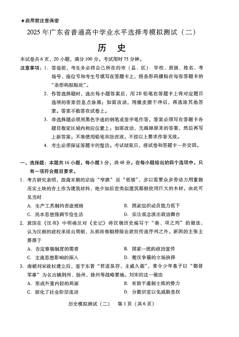 广东省2025年普通高等学校招生全国统一考试模拟测试 历史.pdf